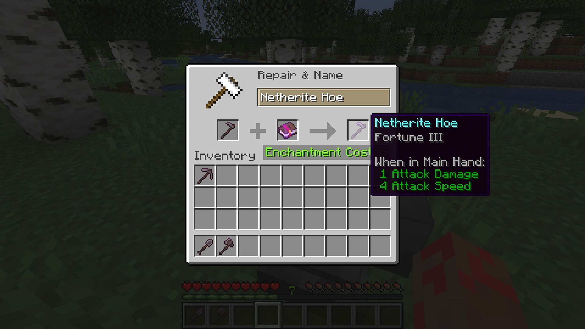 The last tool on which this powerup can be applied is the hoe. This is also one of the least used items in the game since it is only used to break specific blocks and till dirt blocks for farming.