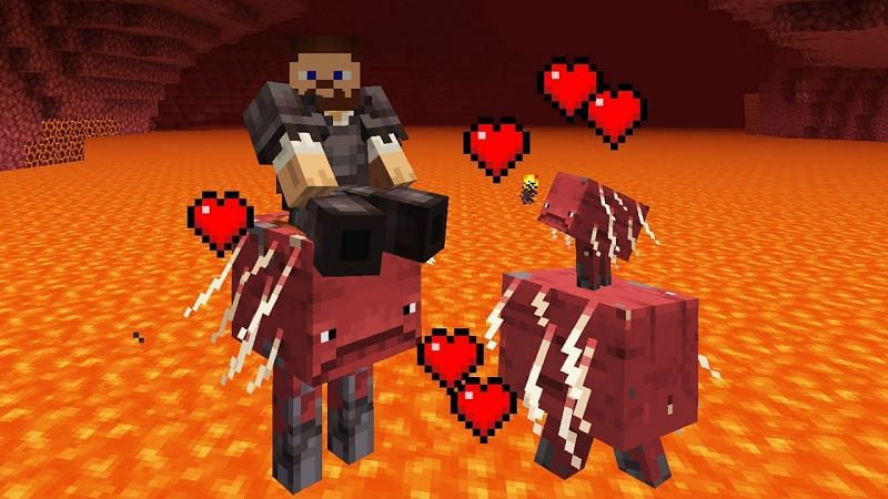 Striders are found on the lava floor of the Nether. These cute mobs prefer to stay warm and will freeze if taken out of the lava. To ride a strider, equip it with a saddle. Minecrafters will also need a fishing rod with a warped fungus attached. This will guide the strider while the player rides it.