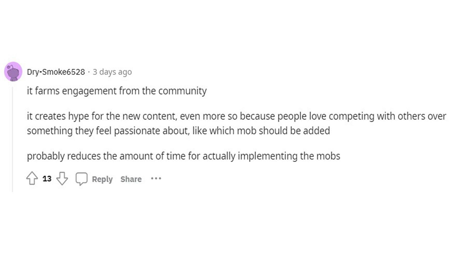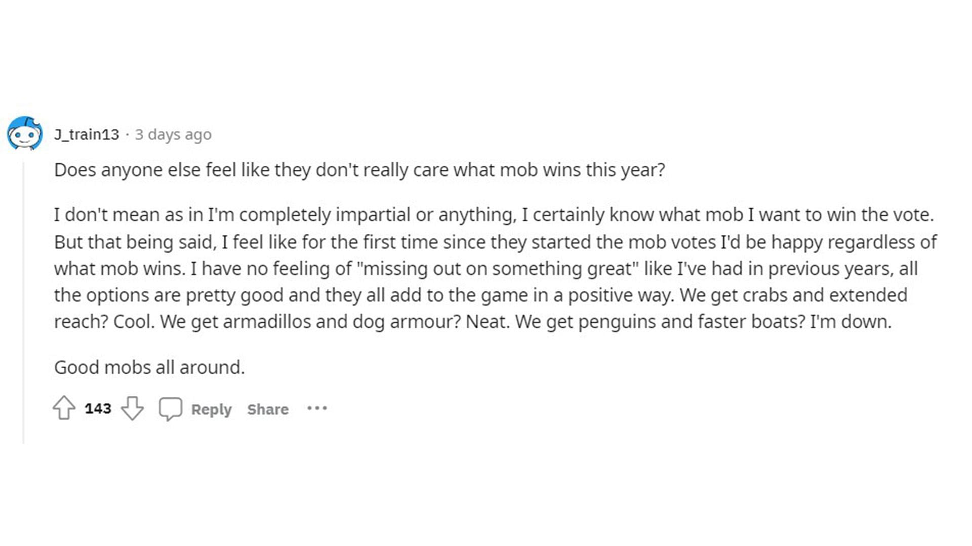 Many of these views suggest that people feel it is unfair for only one mob to be featured every year, stating that developers need to be more proactive. Others state that the voting is unjust, and players don’t get the mob they have been wanting for a long time.