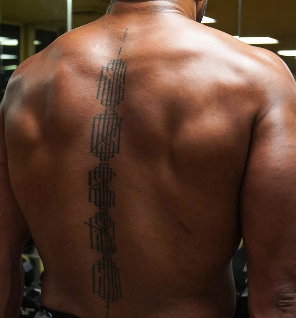 A back tattoo runs along Gane's spine, from the nape to the lower back. Unlike his arm tattoos, which are a bit fluid, this tattoo is somewhat more angular and edgy.