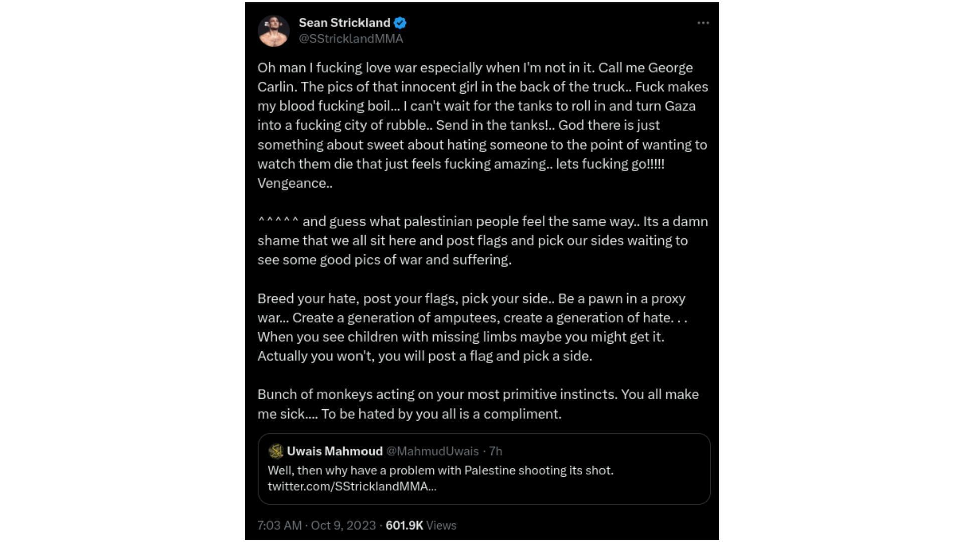 Sean Strickland has since taken to X (formerly Twitter) to address the conflict. The UFC middleweight champ once again spoke without a filter, where he claimed that those supporting either side of the war instead of peace 'make him sick'. He tweeted: