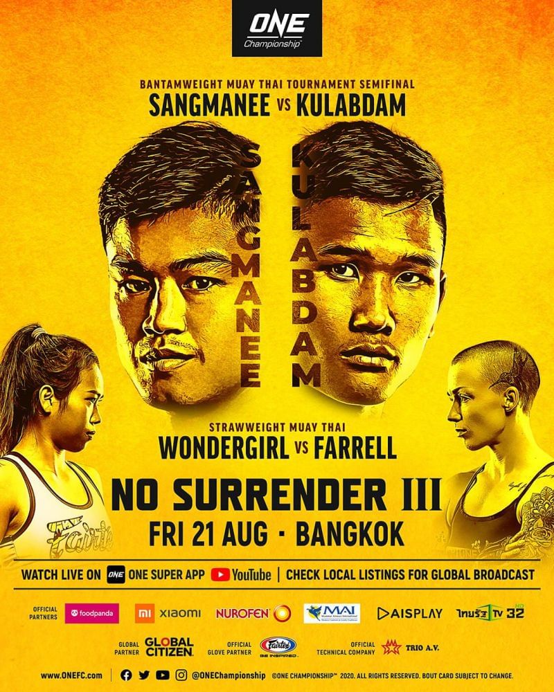 The main event of ONE: NO SURRENDER III features Thai stars Sangmanee Klong SuanPluResort and Kulabdam Sor. Jor. Piek Uthai who will face off in a Muay Thai contest in 4oz. gloves.