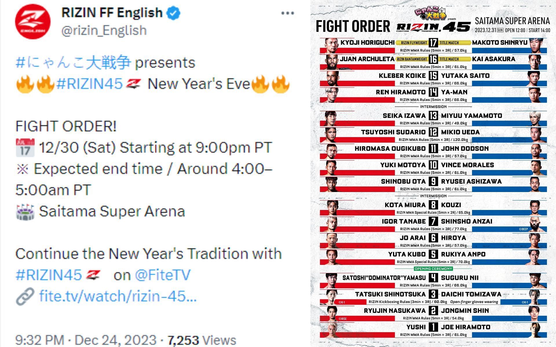 Rizin 45 is scheduled to begin at 2pm JST / 9pm PST and is expected to conclude at approximately 9-10pm JST / 4-5am PT. The event will be available in English and can be purchased on TrillerTV (formerly Fite TV) for 19.99 USD.