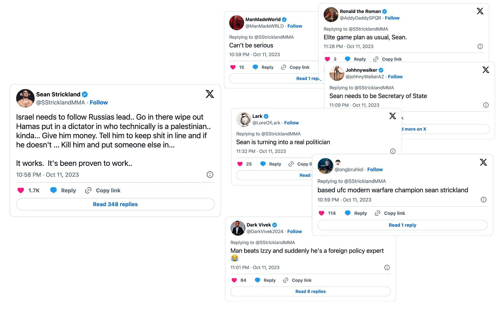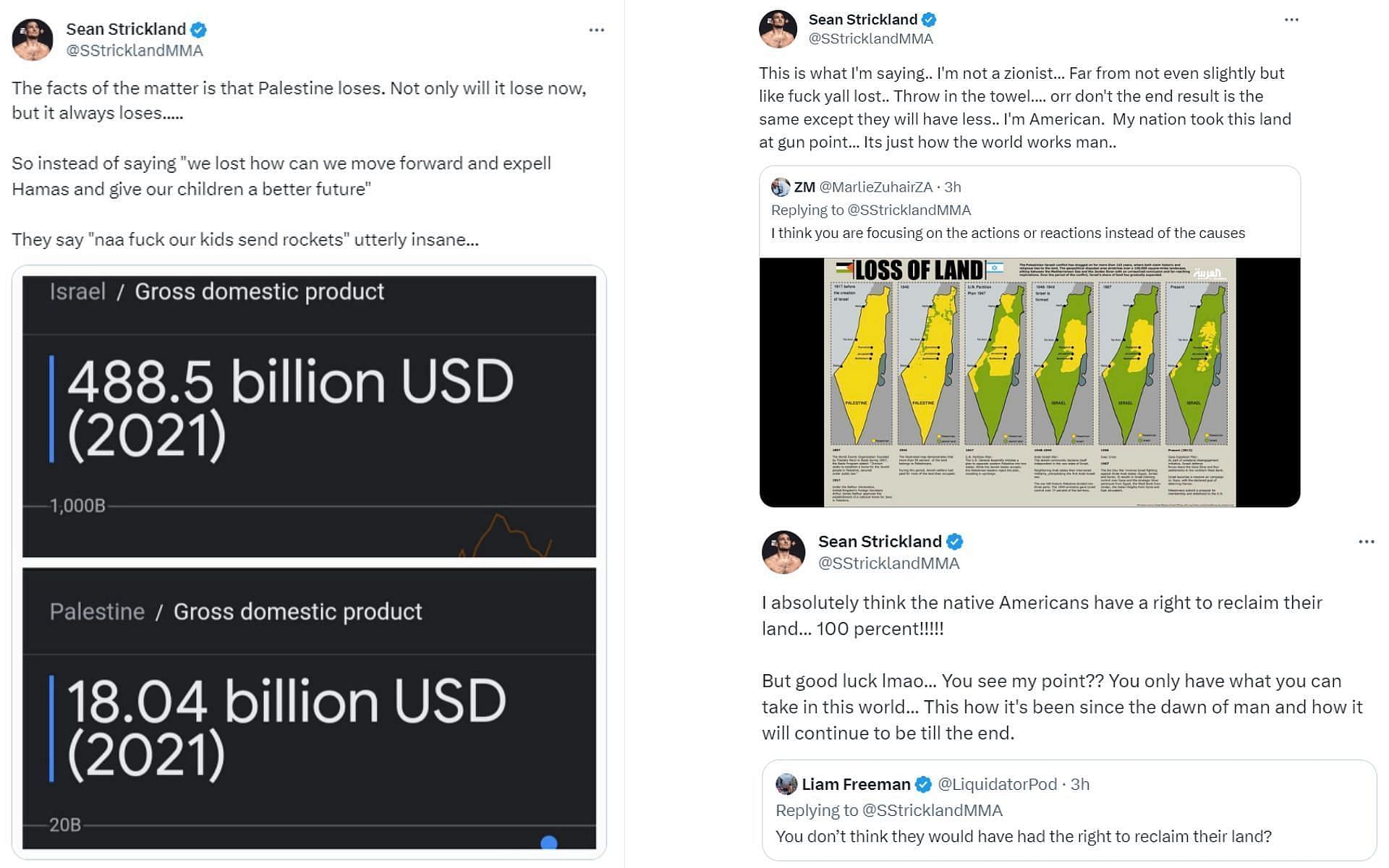 Sean Strickland's recent tweets on the Israel-Palestine conflict may have stirred the MMA Twitter community, but this isn't the first time the middleweight champ has put forth his opinions on the issue. Just a few days ago, he engaged in a series of tweets: