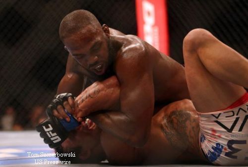 Taking side mount around 30 seconds in, Jones first trapped Belfort’s left arm to deliver some unanswered elbows to the head. With the right arm then isolated, he reached across and instantly yanked it into a keylock, torquing the elbow at a horrible angle and forcing Vitor to tap out almost immediately.
