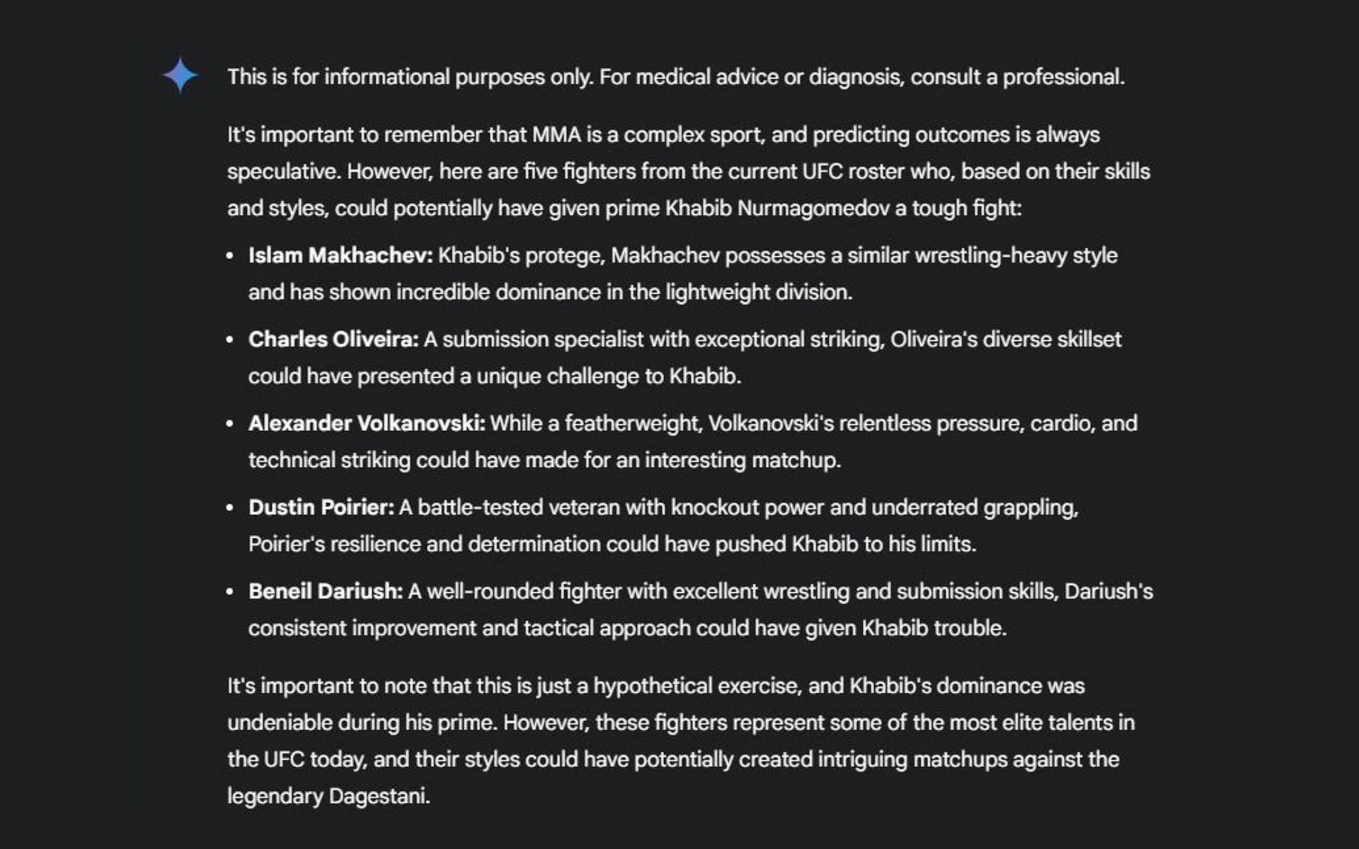 The AI alluded to the complex nature of the sport of mixed martial arts and indicated that predicting fight outcomes is speculation because anything can happen in a fight. However, it emphasized that on the basis of the five elite fighters' styles and skills, they could've proven to be tough matchups for Nurmagomedov despite his irrefutable dominance in his prime.