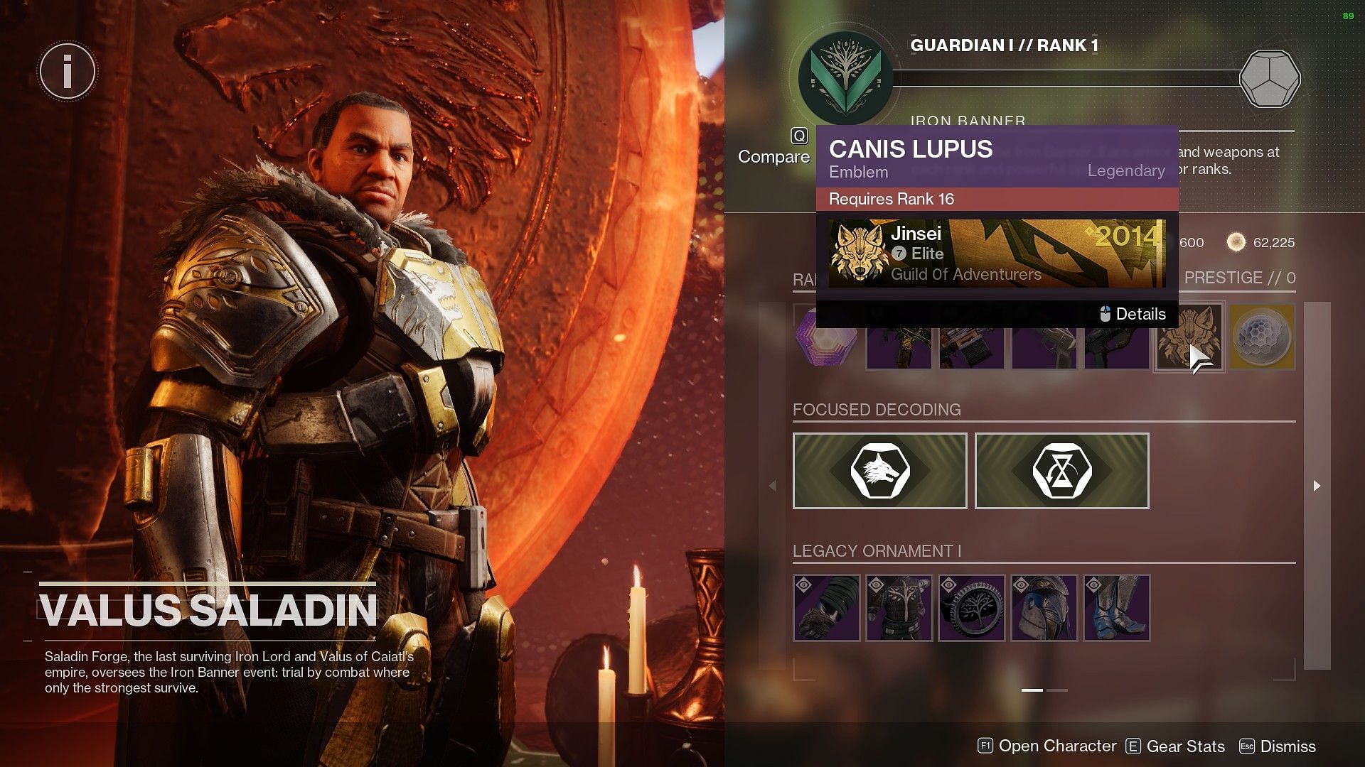Canis Lupus is an exclusive emblem from the Iron Banner activity. Players must reach Rank 16 for the first time on Saladin to get the emblem as a drop. This can be done in many ways, including playing normal Iron Banner matches or using the 'boosted cheese' method.