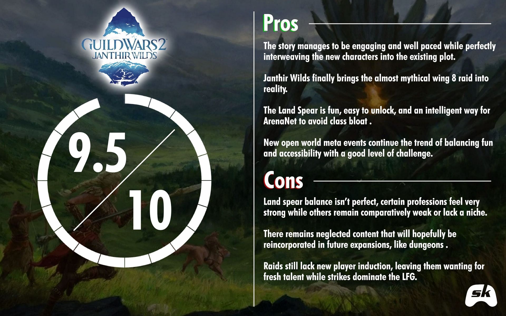 Janthir Wilds is, in my opinion, a reflection of the care ArenaNet has for this game and a culmination of lessons learned from past releases. Though GW2 is not perfect, every update expands on the last and creates a better and healthier game. It has the story focus of EoD, the large-scale meta content of SOTO, the impactful mount mechanics of PoF, and even a new raid as seen in HoT.