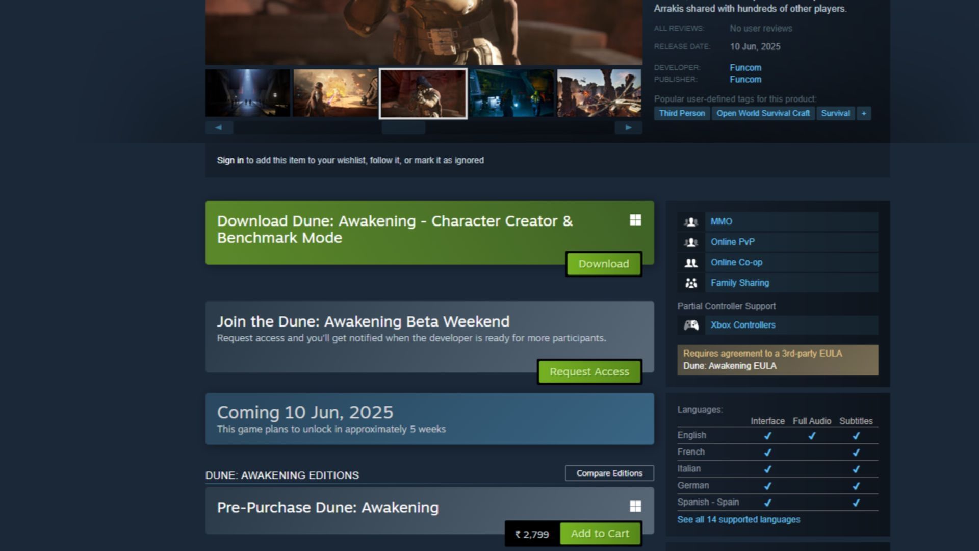 You can also register directly through Steam. Search for Dune: Awakening on the Steam store. There will be an access option that says Join the Dune: Awakening Beta Weekend. Clicking this will request access to the Dune Awakening Beta Test, and you will be added if selected.