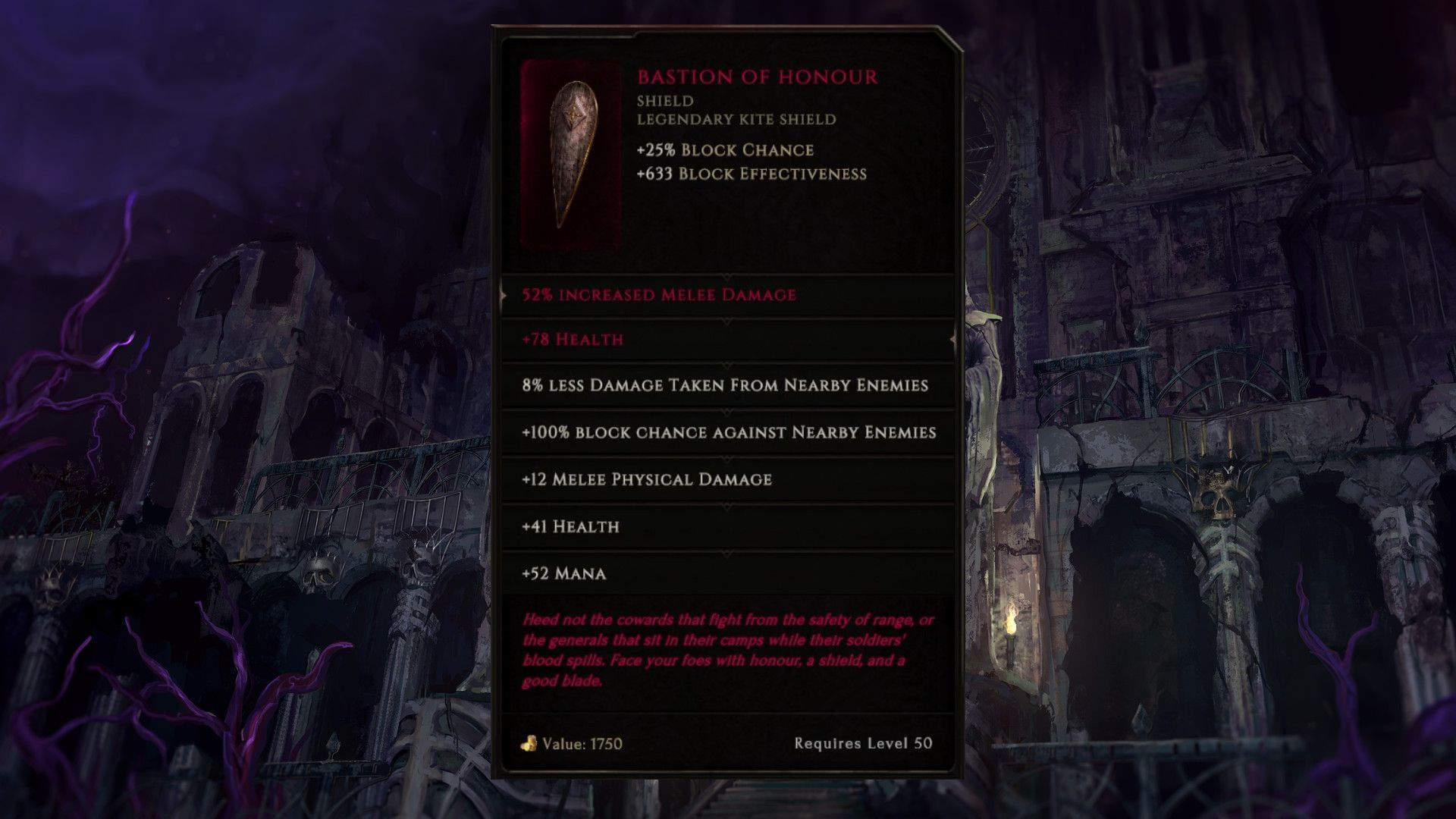 In the screenshot above, the new Legendary Bastion of Honour shield will have some affixes from the Rending Tower Shield of Hope. The Legendary Potential of the unique decides how many affixes from the Exalted will be transferred. Since the Unique Bastion of Hope in the image has a Legendary Potential of two, only two affixes are marked in red.