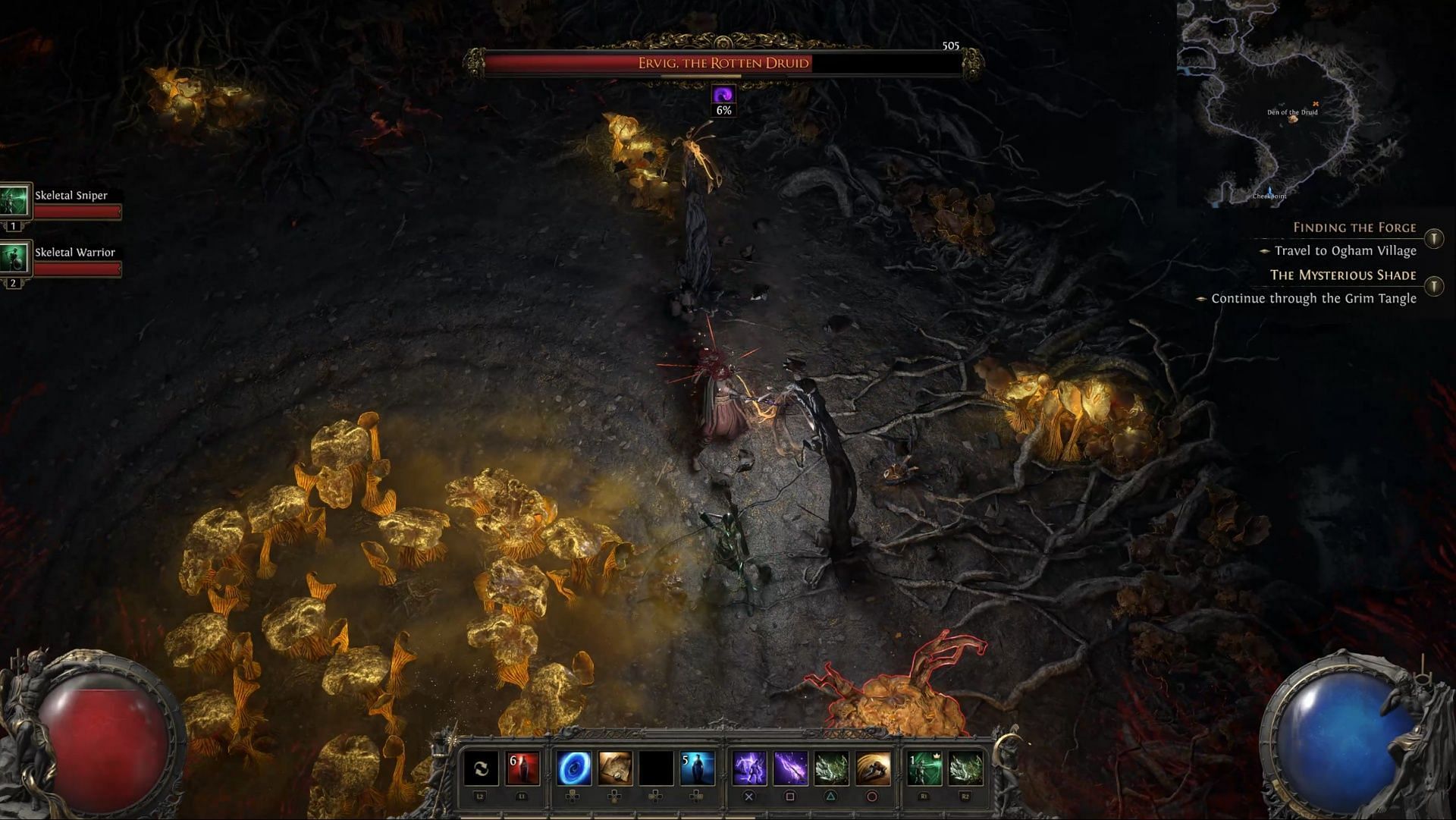 Hidden in Path of Exile 2’s Grim Tangle, Ervig The Rotten Druid awaits players. Located in the Den of the Druid section of the map, this arena has an interesting doughnut shape. There are noxious mushrooms in the center, giving off a constant yellow cloud of gas, and it’s ill-advised to try and wander through it. This forces the player to fight in a circular arena, cut off in the middle. There are more of these mushrooms on the map as well, restricting the player’s movements.
