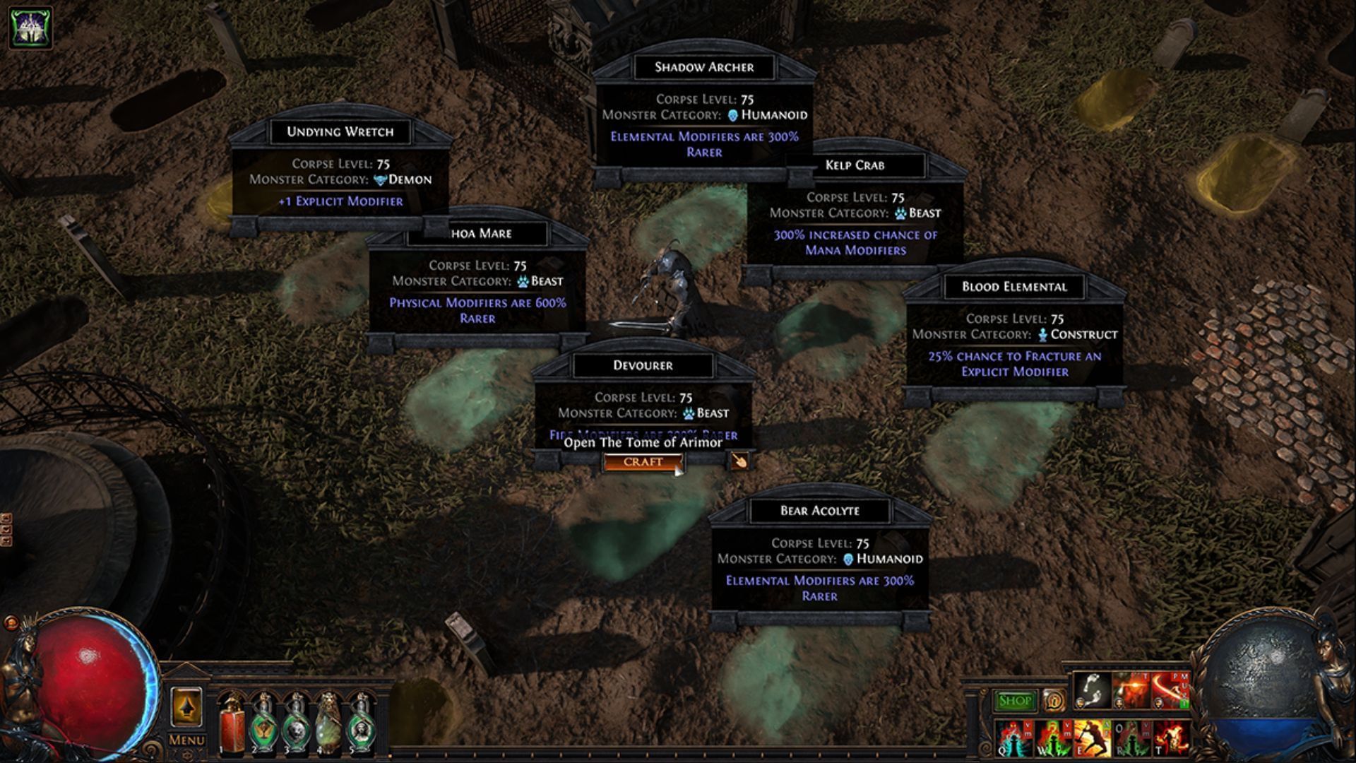 In Path of Exile Necropolis Leauge, some monsters possessed by spirits leave behind a corpse called "Unresolved Anguish" upon defeat. You can collect these corpses by selecting the "Collect" button, and Undertaker Arimor will retrieve them. Take these Corpses to the Necropolis and bury them in graves to forge items using their souls. This method allows you to craft items that you want. Each collected corpse has a unique crafting effect. Combining multiple residues allows you to create one item, and all adjacent corpses contribute to its crafting effect.