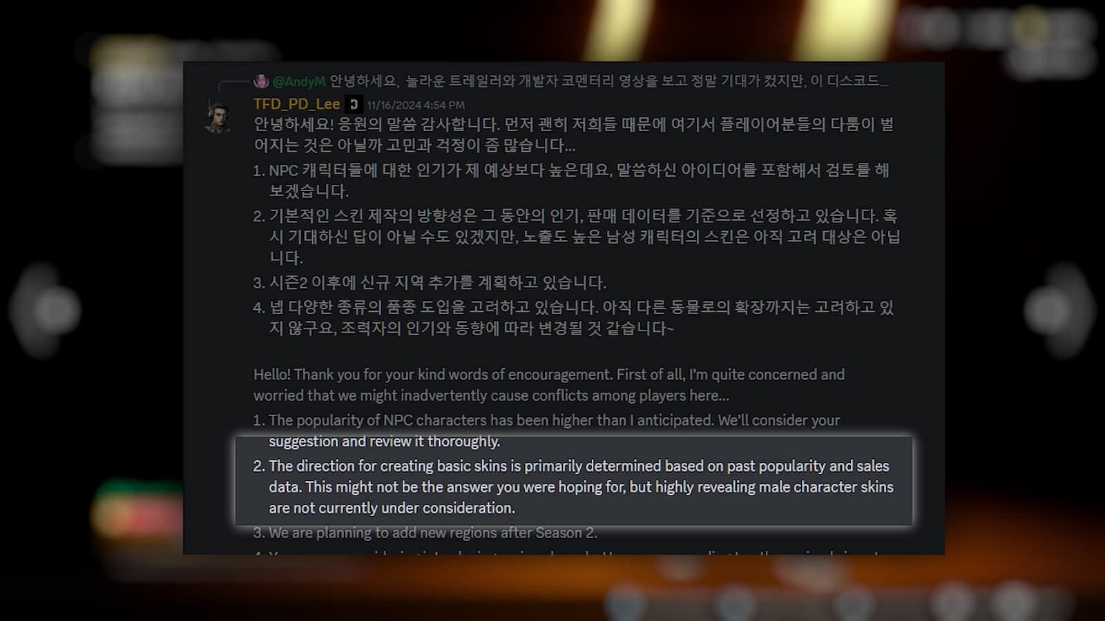 "The direction for creating basic skins is primarily determined based on past popularity and sales data. This might not be the answer you were hoping for, but highly revealing male character skins are not currently under consideration."