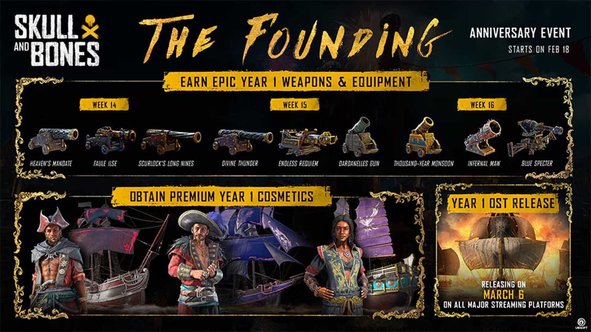 Skull and Bones devs are celebrating their first anniversary with The Founding event, which started on February 18, 2025. This celebration brings new rewards, a limited-time currency, and exclusive activities for players. Ubisoft is also releasing the game's official Year 1 soundtrack on March 6 in an effort to raise as much awareness for this event as possible.