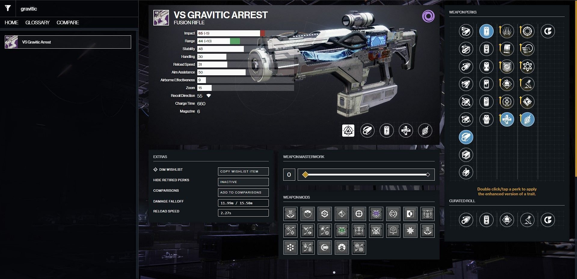 The following perks are recommended on the VS Gravitic Arrest Fusion Rifle for PvE: