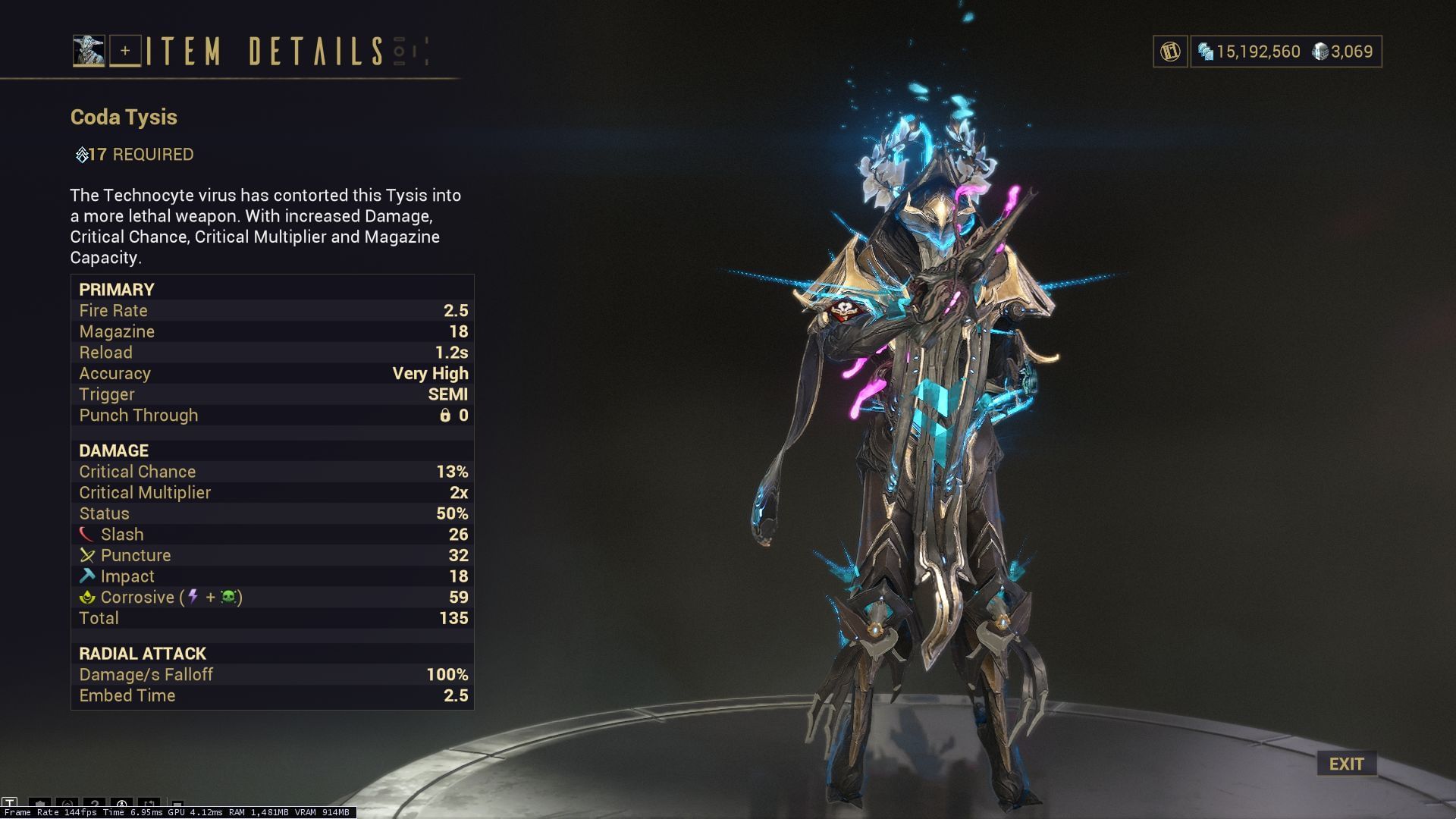 If I'm being completely honest, the weapon needs an additional factor to make it a viable choice in Warframe's current meta. There are far better Status damage spreading weapons and even better Primer weapons for your secondary slot. Coda Tysis will become a Mastery fodder for most players, unless someone discovers a hidden interaction that makes it a meta monster.