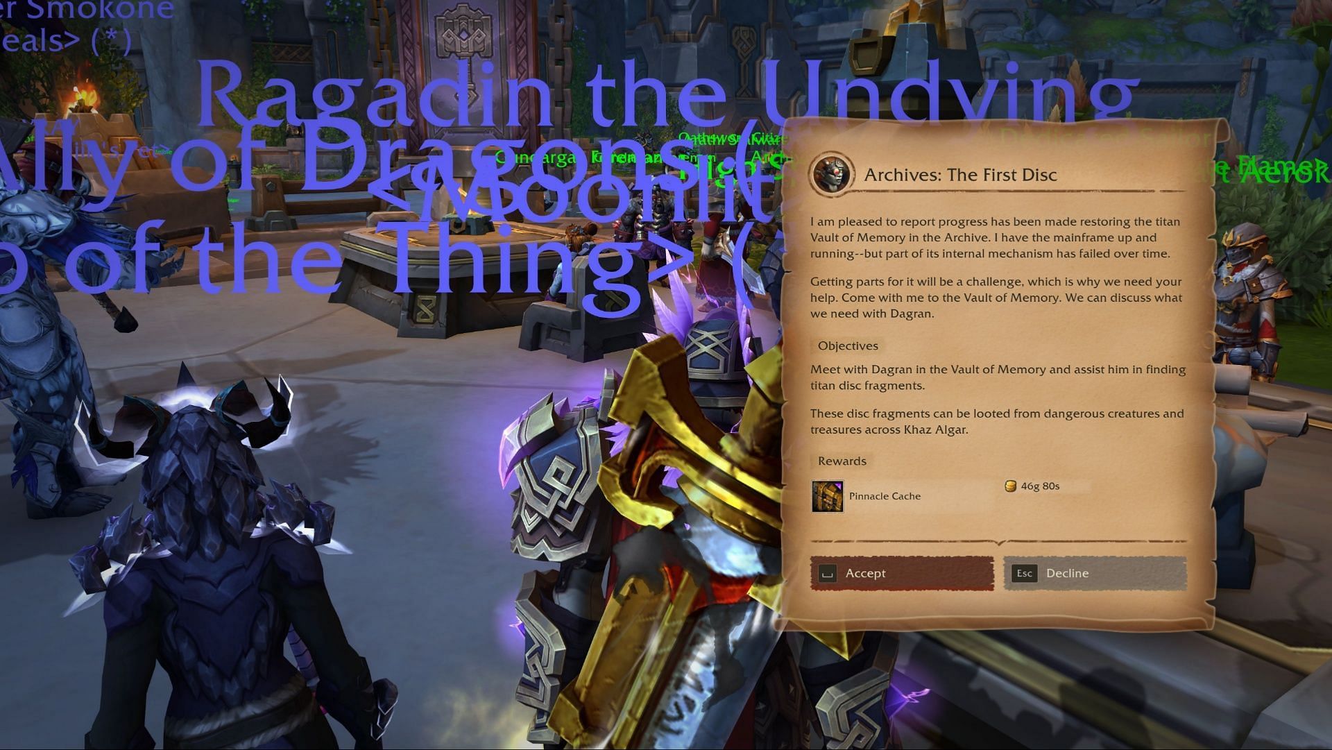 You can pick the quest from High Speaker Brinthe in the same place last week’s Weekly Quest began (/way #2339 46.2 49.0 High Speaker Brinthe) in the hub city of Dornogal. First, you’ll be tasked with meeting Brinthe at the Vault of Memory and speaking to Brinthe. You’ll be tasked with finding 100 Titan Disc Fragments scattered throughout Khaz Algar. The game keeps it nice and vague. You can find them from “creatures and treasures across Khaz Algar”.