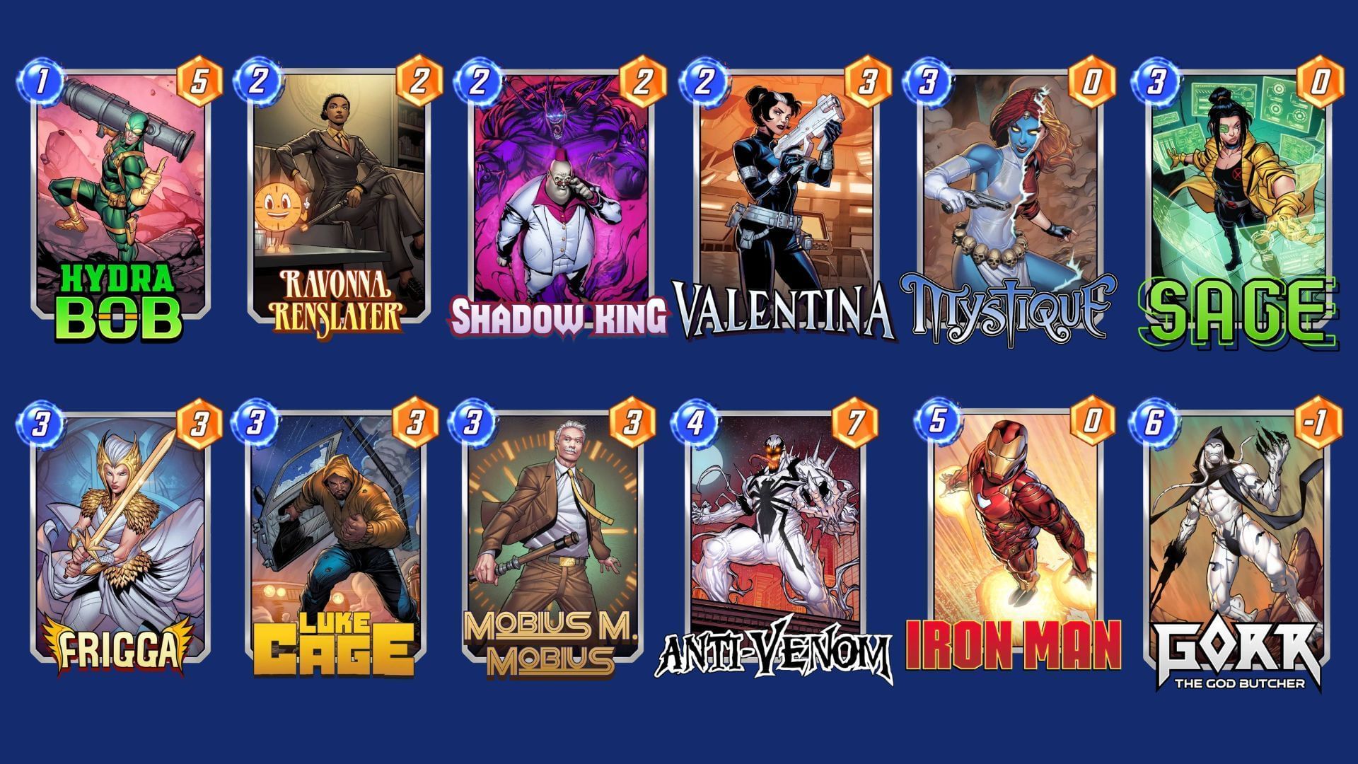 This deck leverages Frigga's ability to swap card costs, allowing for explosive plays with high-cost cards like Iron Man and Anti-Venom. The synergy between Shadow-King and Mystique helps control opponent strategies while boosting your own.