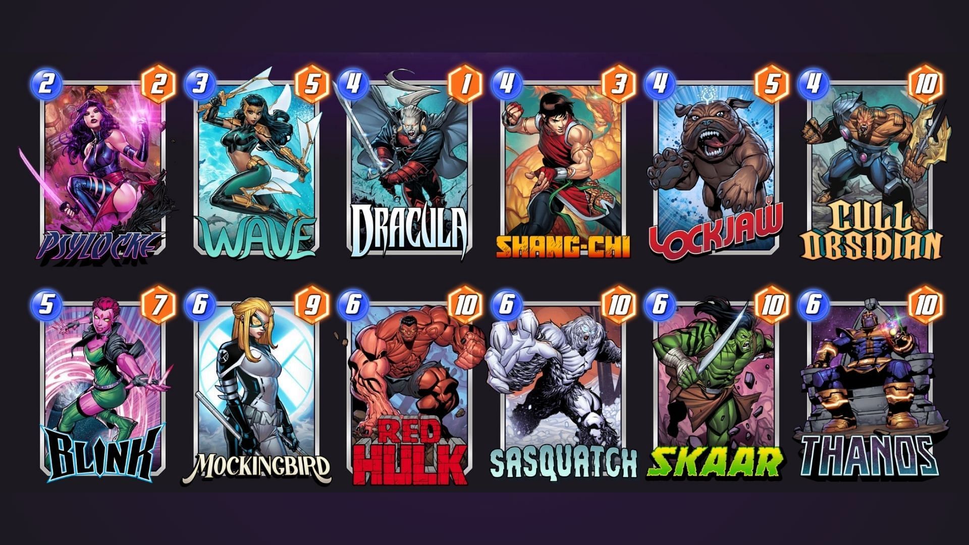 This deck focuses on utilizing Lockjaw to swap cards effectively, allowing for powerful plays with high-cost cards like Vision and Cull Obsidian. Psylocke provides an energy ramp, enabling earlier plays. The combination of Nocturne and Mockingbird can create a strong board presence while Hope Summers can capitalize on the opponent’s plays. The goal is to control the board while setting up for a powerful endgame with Thanos.