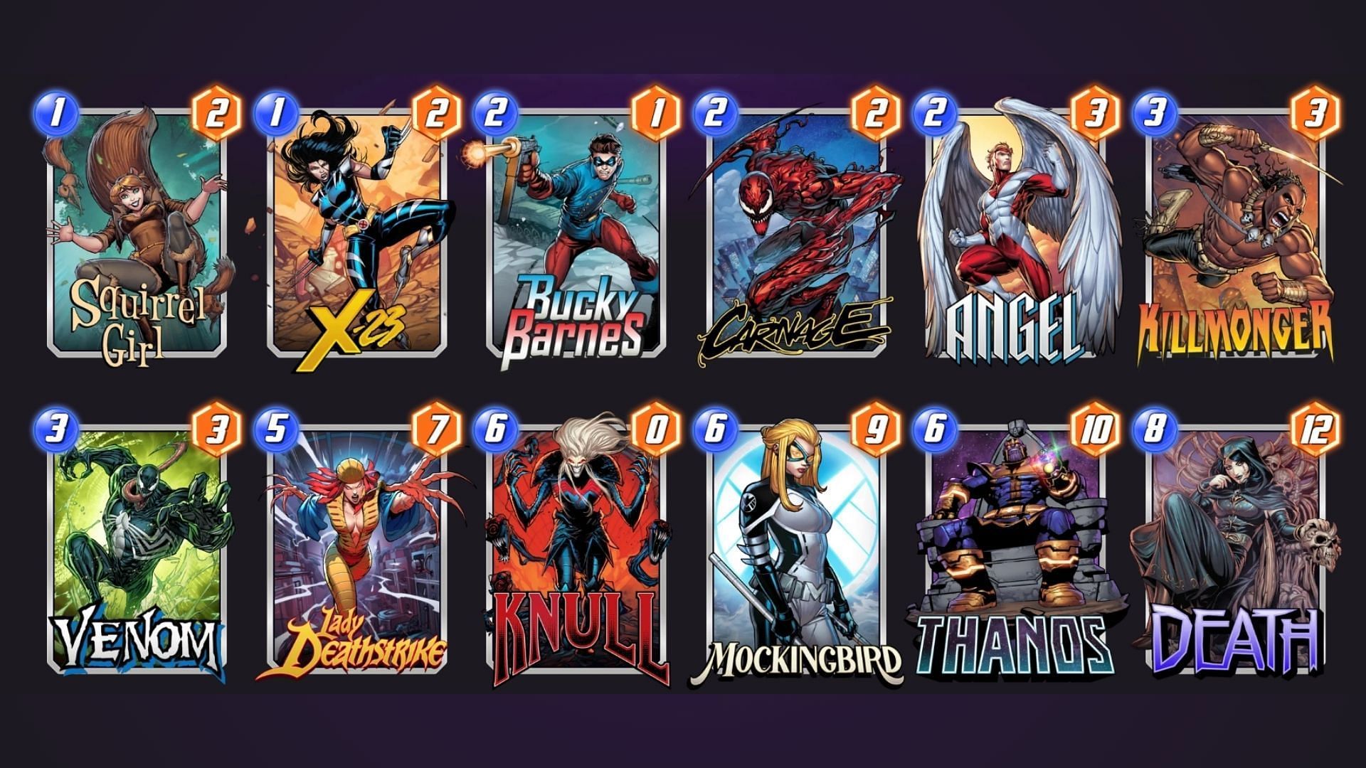 This deck focuses on destruction mechanics, using cards like Carnage and Killmonger to clear out weaker units while powering up Knull and Death. Squirrel Girl and X-23 provide early board presence that can be sacrificed for greater gains later. The goal is to control the board through destruction while setting up for a powerful finish with Thanos and Knull.