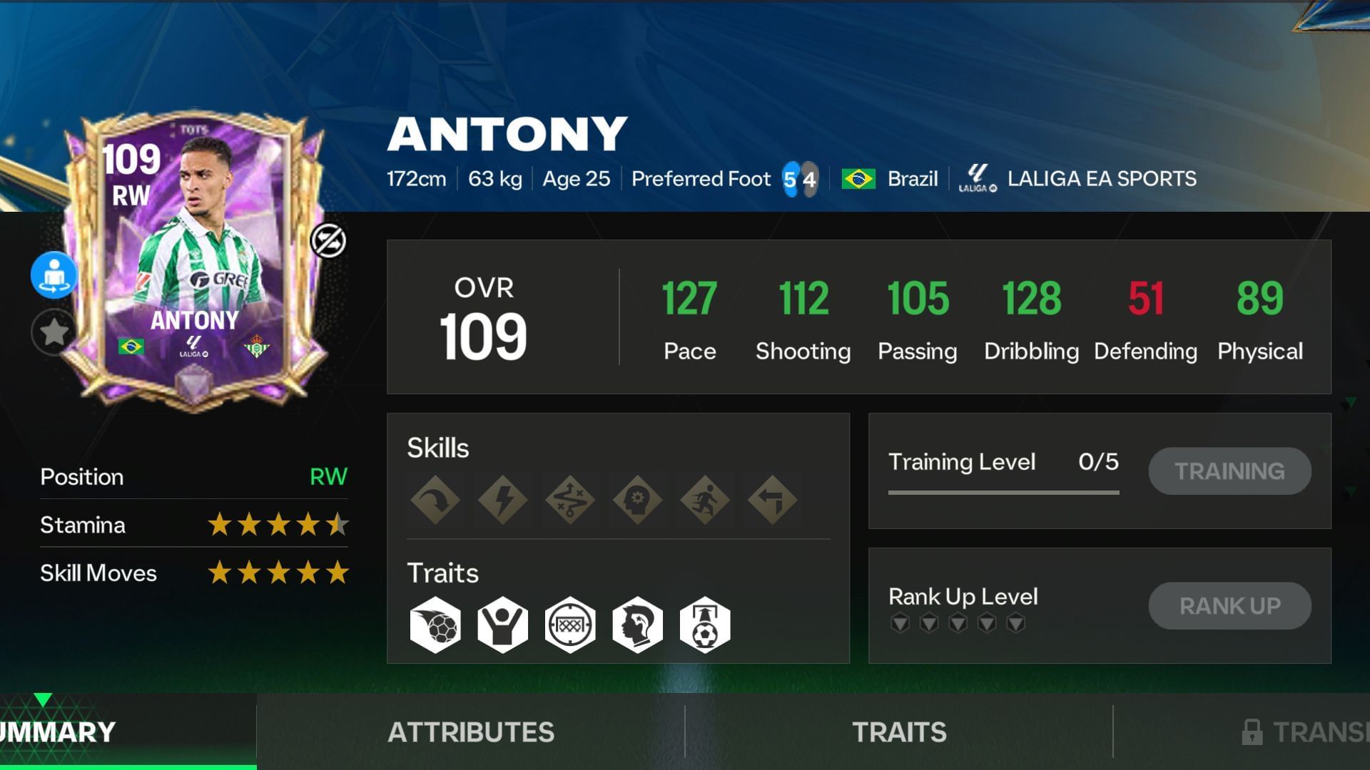 Listed below are all the stats of the 109 RW Antony TOTS 25 card: