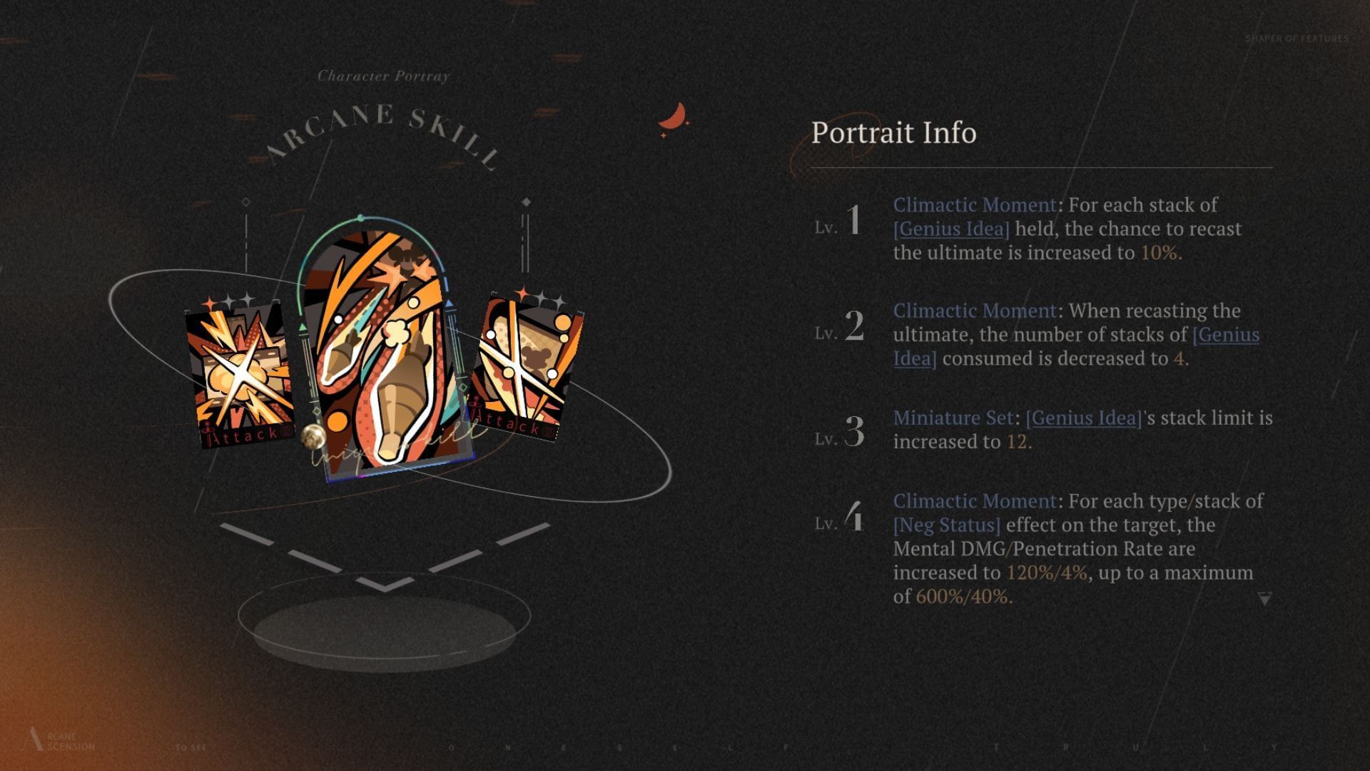 - Climactic Moment (Ultimate Skill): This skill deals 450% damage to all enemies. It gains a 100% Mental damage buff/3% penetration rate (up to 500% Mental damage buff and 30% penetration rate) for each type/stack of negative status on the target. The Arcanist gains a 6% chance to recast Climactic Moment for each stack of Genius Idea. When the Genius Idea reaches eight stacks, she gains an additional 40% chance to recast the skill. She consumes five stacks of Genius Idea for every recast.