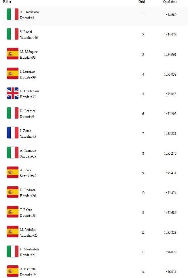 Ducati Pramac's rider Danilo Petrucci grabbed the 6th position. Yamaha Tech 3's Johann Zarco followed Petrucci at the 7th spot. Suzuki Riders Andrea Iannone and Alex Rins finished behind Zarco at 8th and 9th spots respectively. Racing in his last season, Repsol Honda's Dani Pedrosa completed the top 10 spots at the grid for the tomorrow's race.