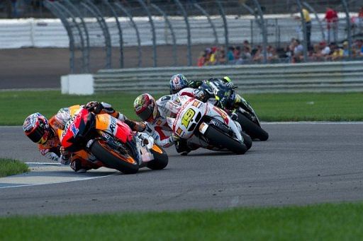 Casey Stoner leads the field during the Indianapolis Grand Prix in August. Stoner has missed the last three events after injuring his right knee in a crash while qualifying at Indianapolis.