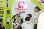 Hector Barbera discusses the Qualifying results at the Pramac Racing box. Picture: www.ridingfastandflyinglow.com