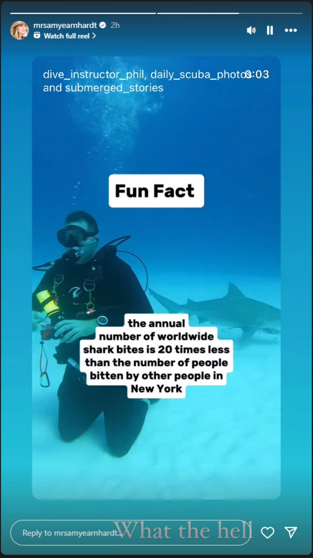 Dale Earnhardt Jr.'s wife, Amy Earnhardt, shared her reaction to a fun fact about annual shark bite cases. Earnhardt was surprised to find out that more people in New York get bitten by other people than shark bites globally.