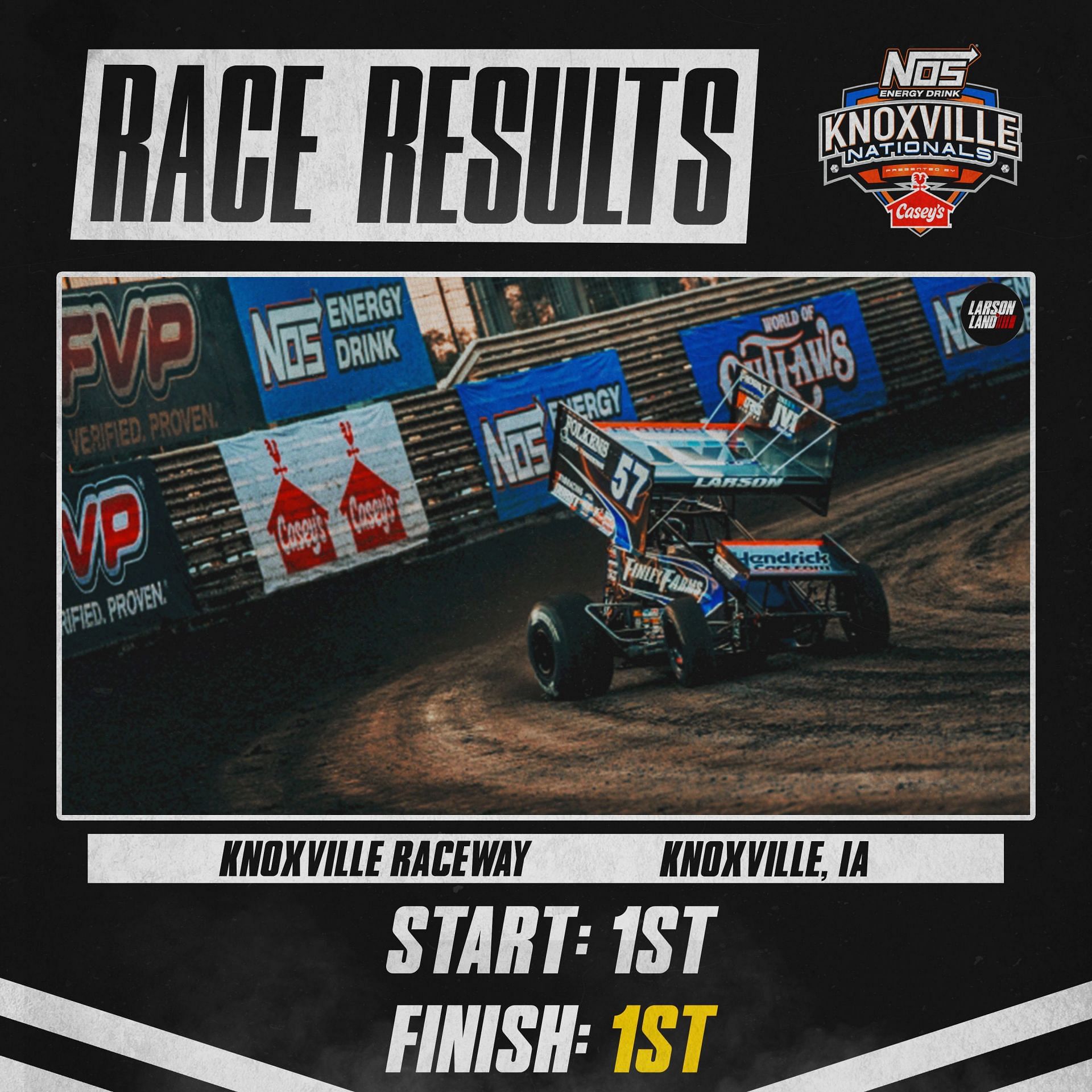 After wrapping up the practice and Qualifying for the Verizon 200 at IMS, Larson headed to the Knoxville Raceway for the premier sprint racing event. Starting in pole position, Larson put on a clinical performance as he led from the green to the checkered flag and decimated the field over the 50-lap feature.