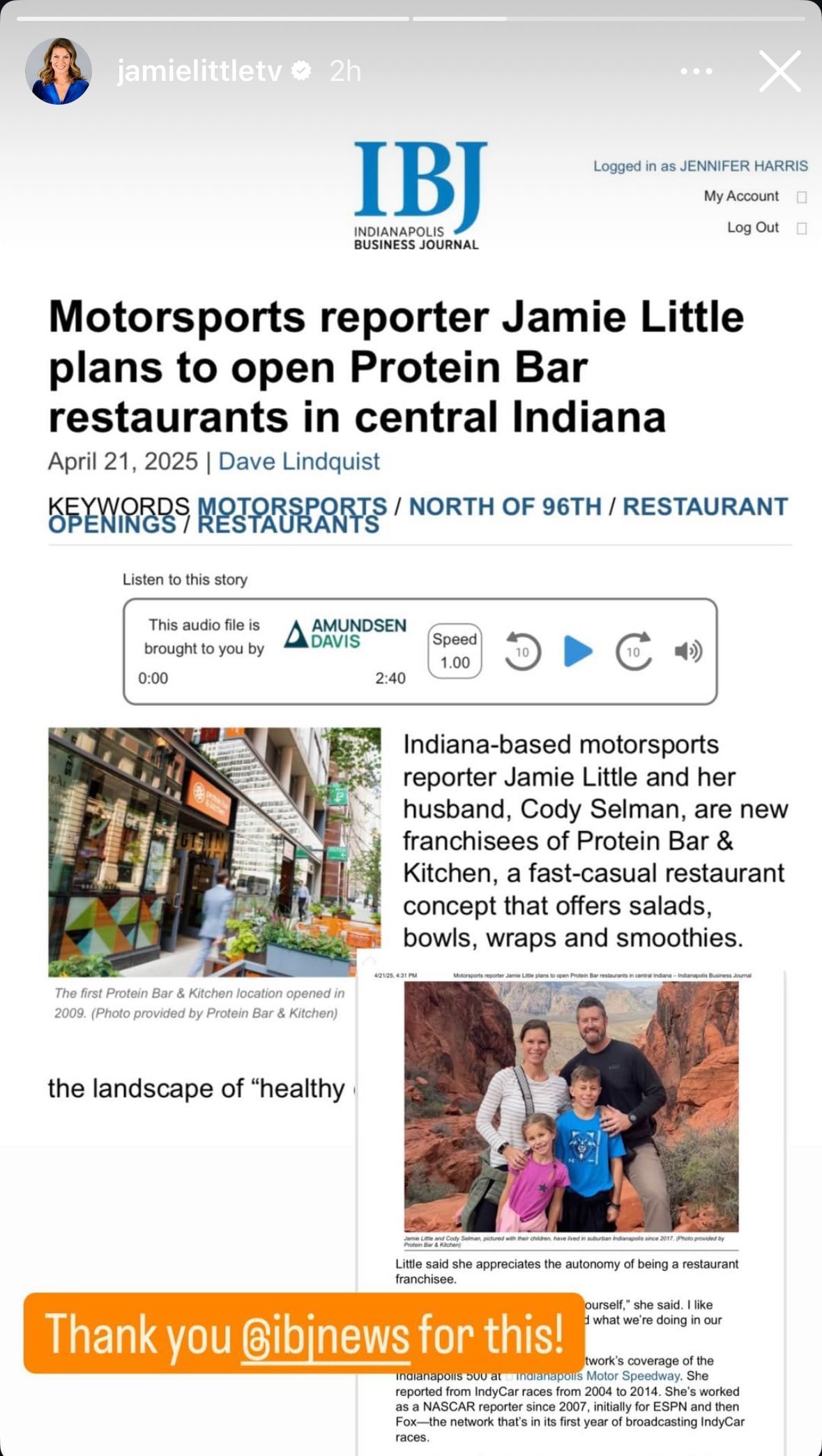 Little shared a screenshot of the article to her story, which was titled "Motorsports reporter Jamie Little plans to open Protein Bar restaurants in central Indiana." She penned a five-word caption on the post, writing: