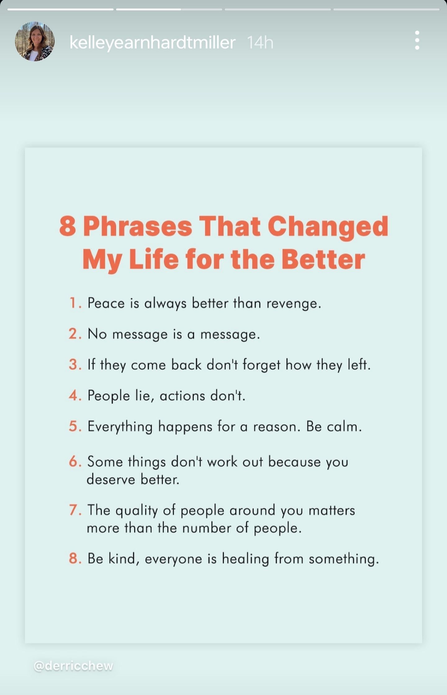 Kelley Earnhardt took to her official Instagram account to share eight life-changing phrases. The sister of former NASCAR driver Dale Earnhardt Jr., who often makes use of her social media to share important advice with her followers, did not act differently on Thursday as she put "peace" over "revenge."