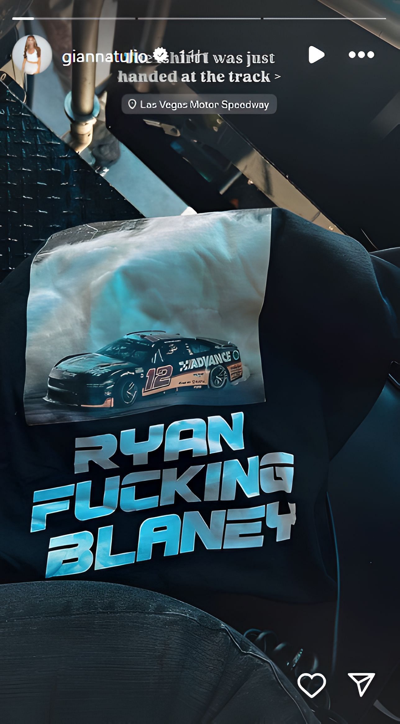 Ryan Blaney's fiance Gianna Tulio visited the Las Vegas Motor Speedway to see her future husband in action. While she was at the racetrack, the 25-year-old was handed a t-shirt, apparently by a race fan. How the defending Cup Series champion was mentioned on the apparel prompted Gianna to showcase it on her Instagram story.