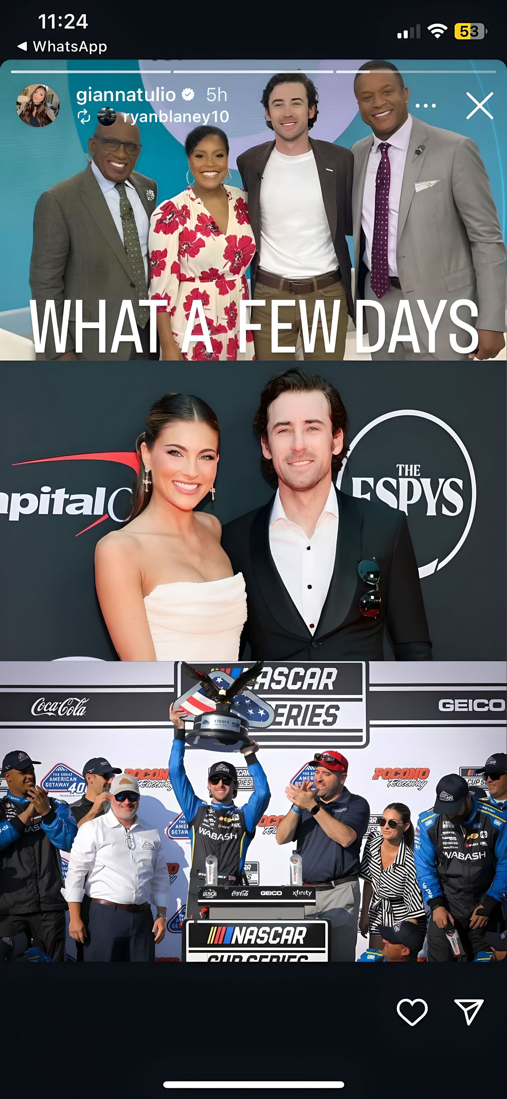 Taking to Instagram, Gianna shared a story with snippets of Ryan Blaney's three stints during the past week, quoting: