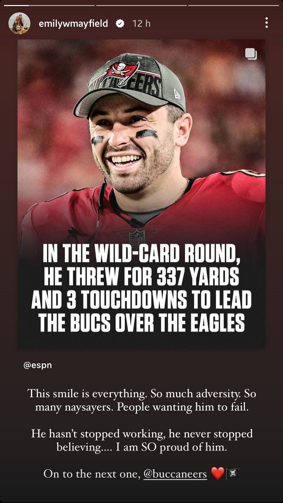 "This smile is everything. So much adversity So many naysayers. People wanting him to fail. He hasn't stopped working, he never stopped believing... I am so proud of him. On to the next one, Buccaneers (heart and Jolly Roger emojis)."