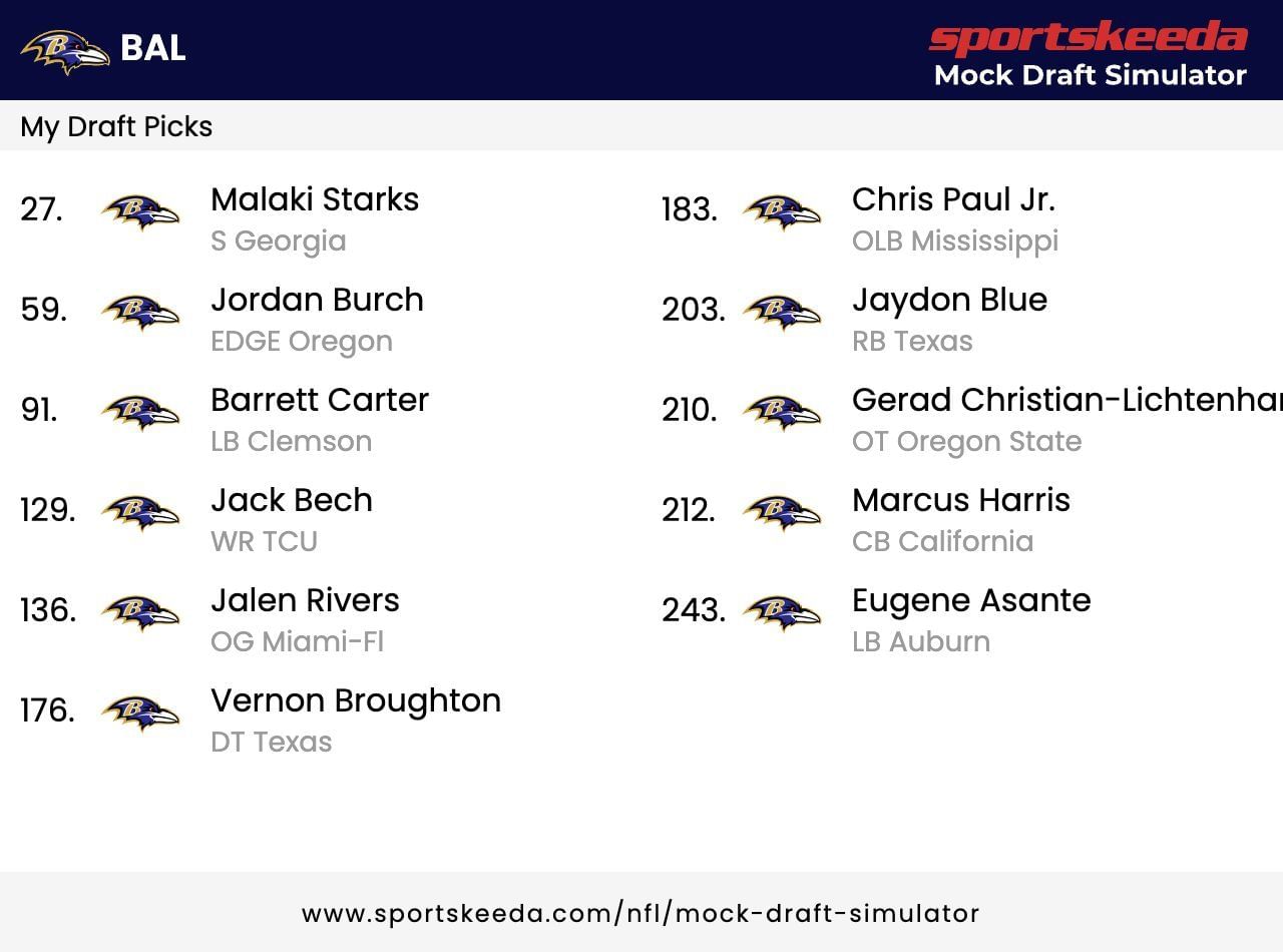 In Sportskeeda's mock draft simulator, the Ravens select another defensive player with their third-straight pick as Baltimore picks Barrett Carter, a linebacker out of Clemson.