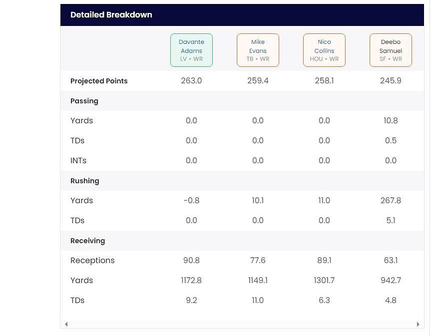 One of the most important factors that makes Adams one of the best wide receivers to draft in fantasy football is his proven ability to put up massive numbers, despite his quarterback situation. His four finishes among the top-three fantasy wide receivers have come with three different primary quarterbacks: Aaron Rodgers, Derek Carr, and Aidan O'Connell.