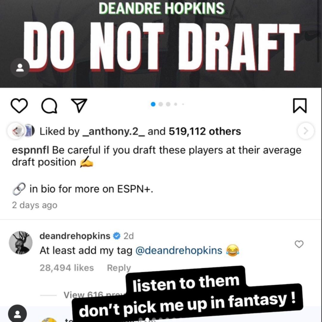 The network labeled the wide receiver as a player to avoid drafting in fantasy this season via an Instagram post. Hopkins shared a warning on his own Instagram account: