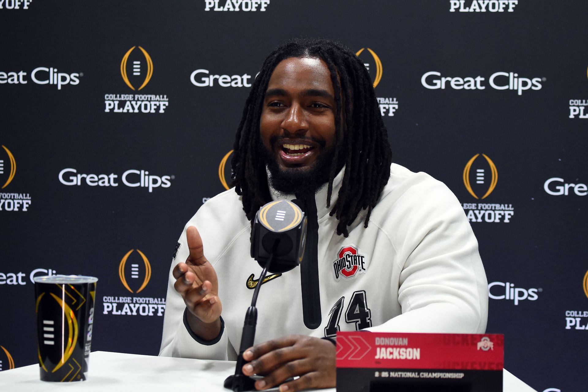 A. Donovan Jackson wears jersey number 74, representing the Ohio State Buckeyes.