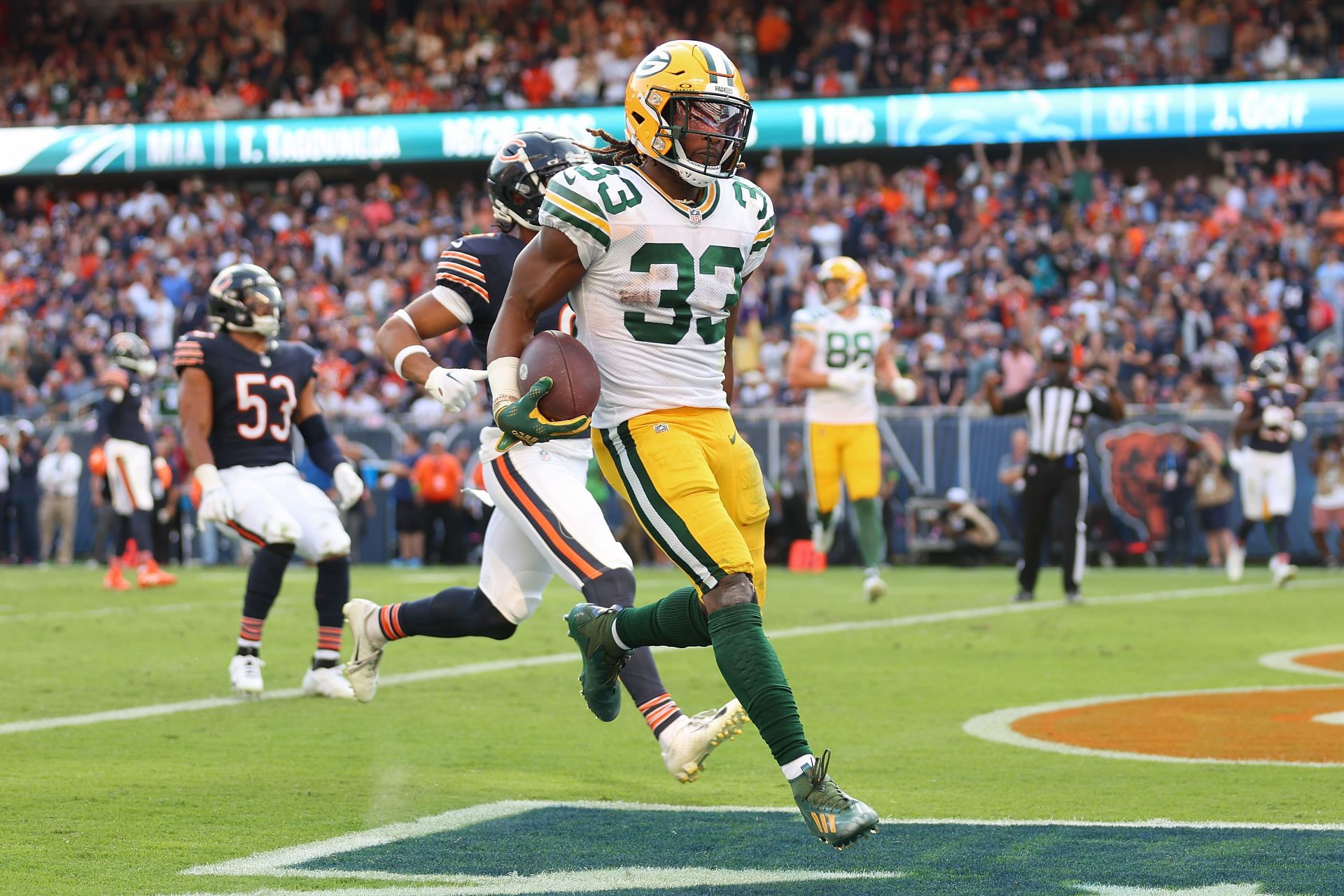 Jones suffered a hamstring injury on a TD catch versus the Bears in Week One. He was seen holding his leg as he got to the end zone. The Packers star was ruled questionable to return and replaced AJ Dillon.