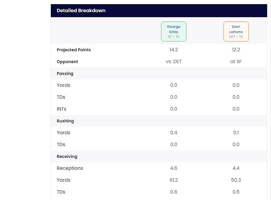 Sportskeeda's Who Should I Start tool predicts that Kittle will score two additional fantasy points than LaPorta this week. He holds superior projections across the board, especially in expected yardage, clearly making him the better pick.