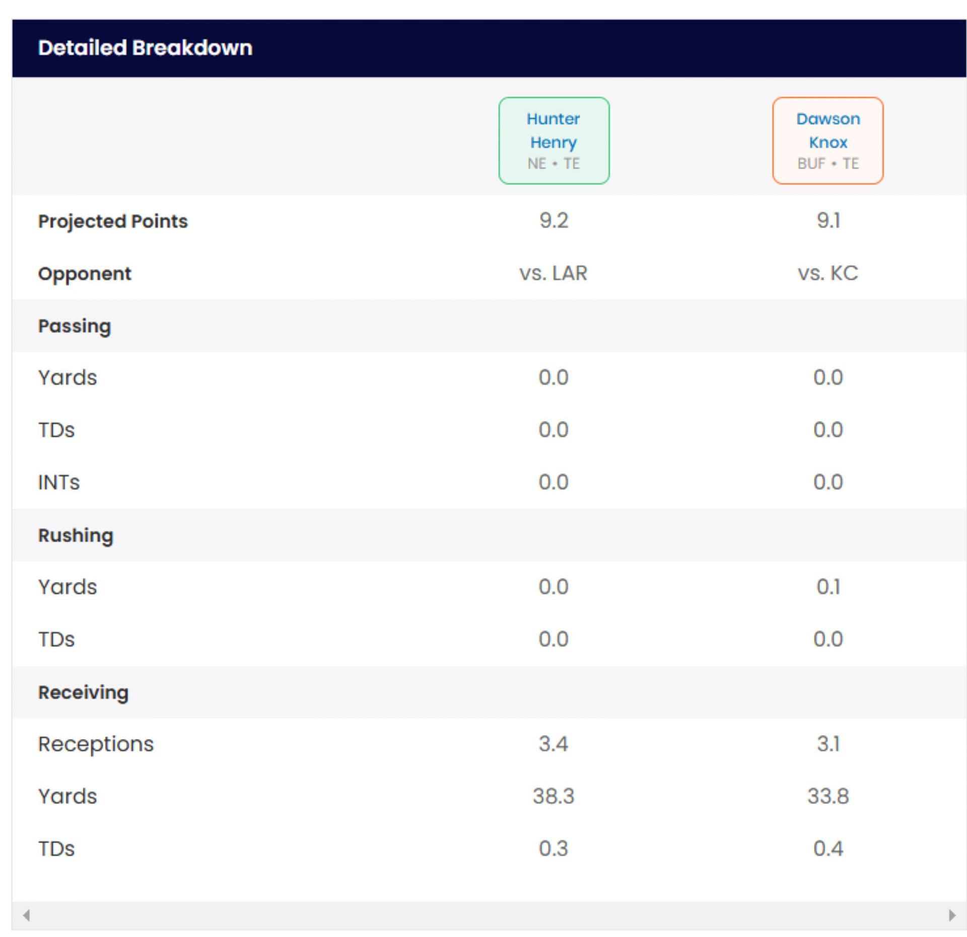 The Patriots veteran is projected to tally 9.2 fantasy points against 9.1 from Knox. His projected receptions are 3.4, while Henry is expected to get 3.1. The projected receiving yards also give Henry the edge (38.3 to 33.8), meaning he can be the right choice on Sunday, but nothing will happen if you go with Knox.