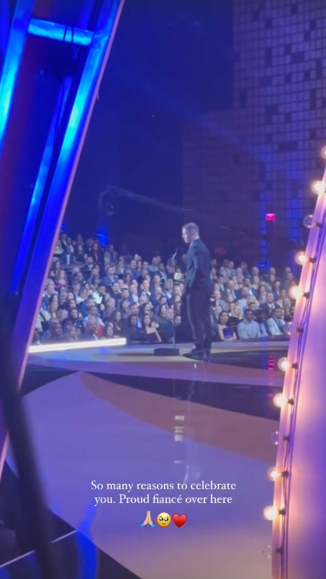 The Miss Universe winner showed up to the event in style, wearing her engagement ring, a white and black outfit, and diamond-encrusted gold bracelets. She was backstage when McCaffrey was given the award, sharing her pride in him.