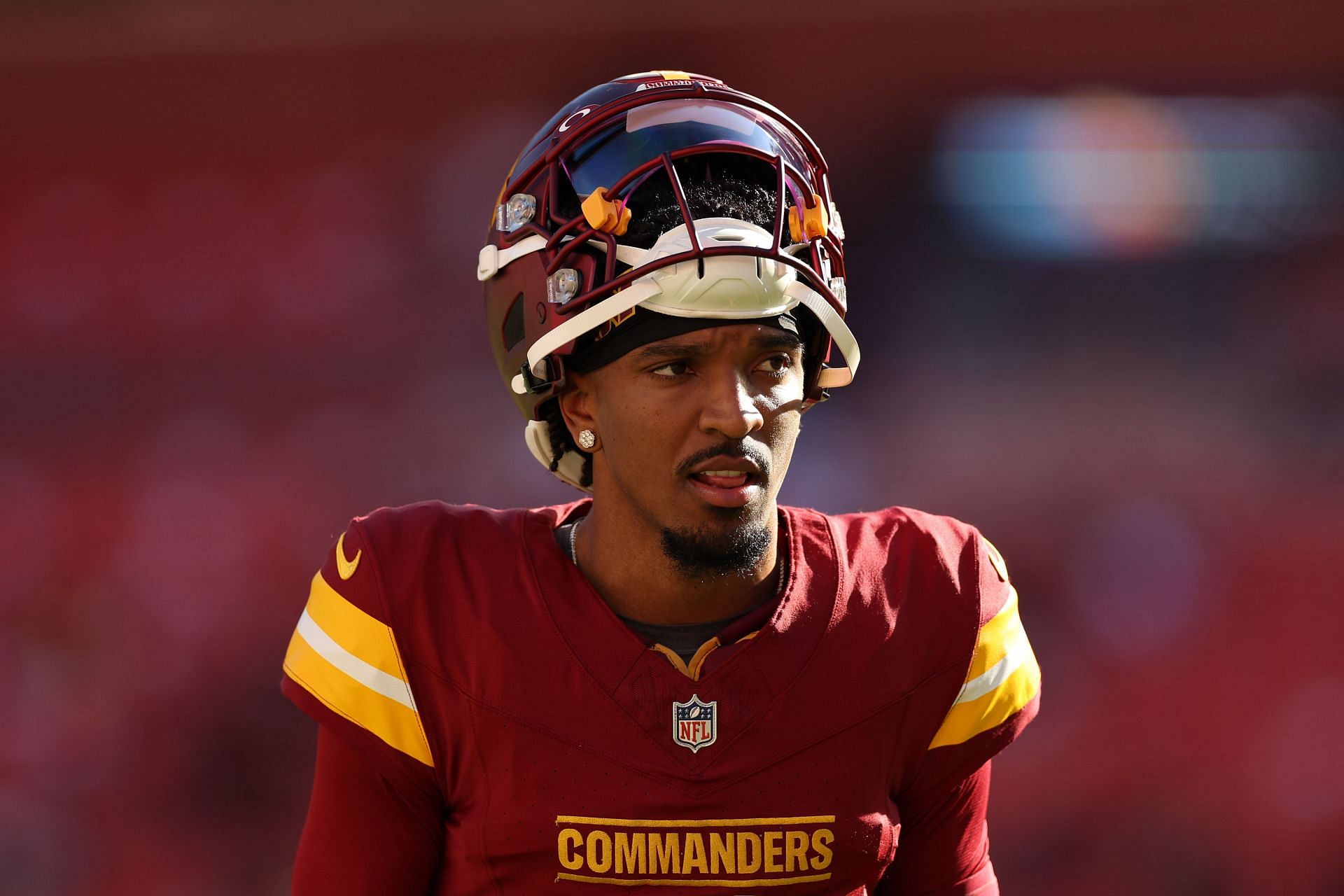 Daniels wears jersey number 5, representing the Washington Commanders in the NFL. As of Week 7 in the 2024 NFL season, Daniels has completed 127 of 168 passing attempts for 1,410 yards, 6 touchdowns, and 2 interceptions. he has also rushed for 372 yards and 4 touchdowns. According to the Commanders' injury report, which is available on their official website, he was listed with a rib injury for Week 8 of the 2024 NFL season, which he sustained in a game against the Carolina Panthers in Week 7.