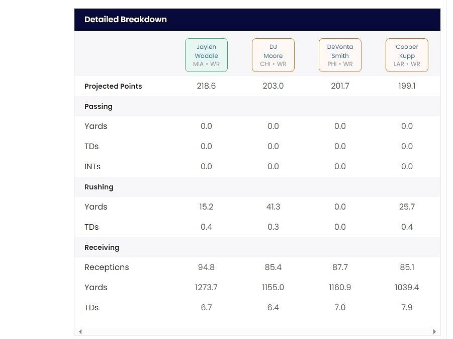 Sportskeeda's Who Should I Draft tool recommends selecting Waddle in favor of some other veterans who also serve as the second option on their NFL teams, such as DeVonta Smith and Cooper Kupp. He also has higher projections than DJ Moore, who is the WR1 for his team but plays in a crowded offense with a rookie quarterback. Waddle is a solid pick at his 2024 ADP.