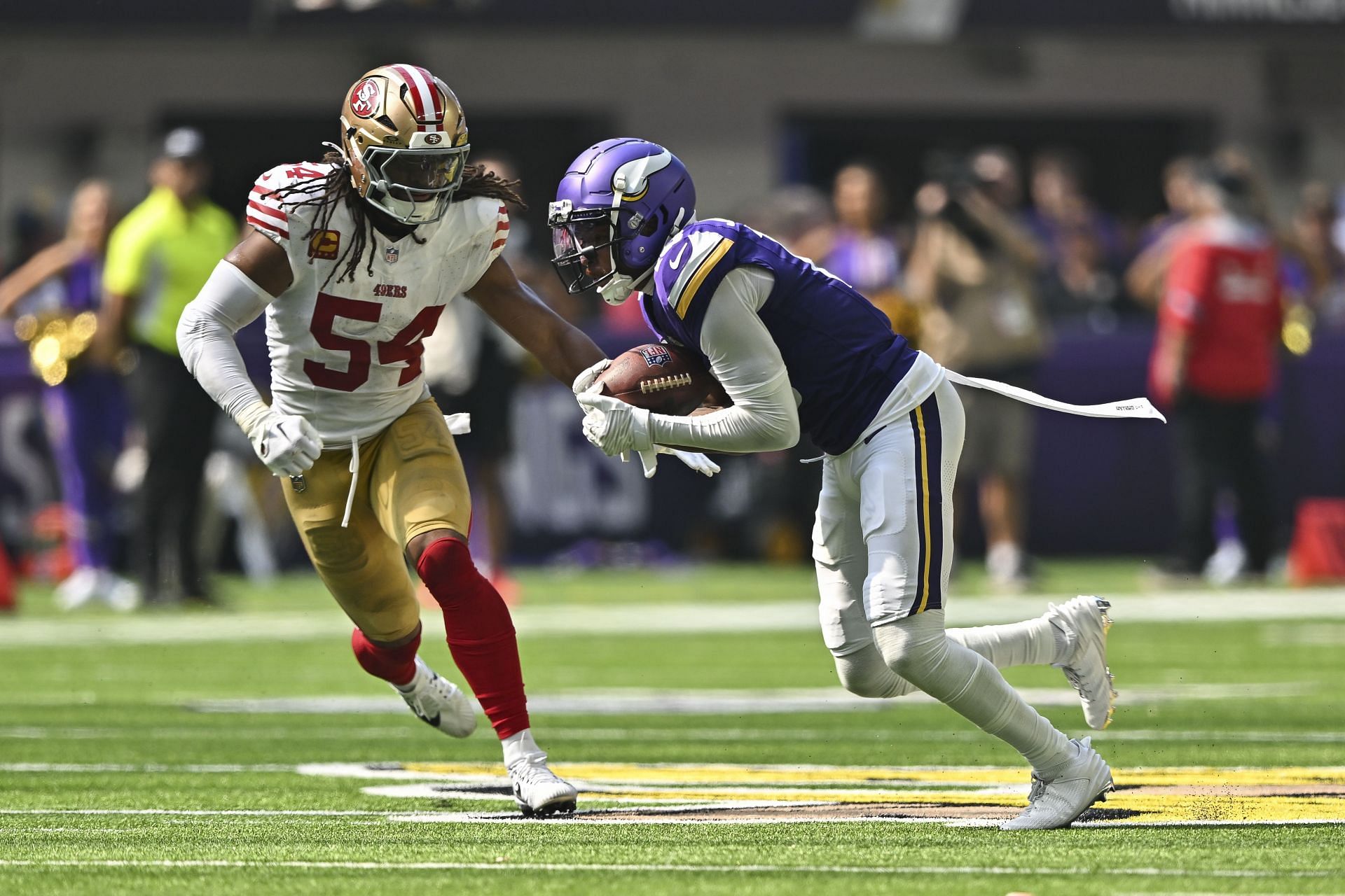 In the first game of the season, Jefferson had a solid outing against the New York Giants, recording four catches for 59 yards and a touchdown. In Week 2, he had four receptions for 133 yards including a 97-yard touchdown reception against the San Francisco 49ers in the Vikings' win.