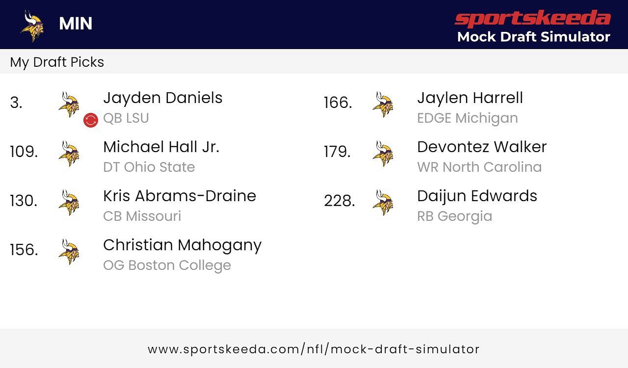 The Minnesota Vikings initially had an 11th overall pick in the 2024 NFL Draft. But in this case, Sportskeeda’s Mock Draft Simulator agreed to a trade between the Vikings and the New England Patriots.