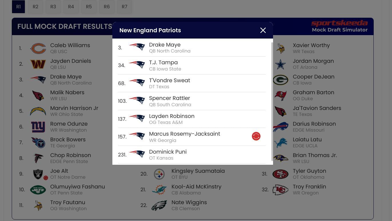 The simulator wastes no time for the Patriots potentially finding their next quarterback in this mock draft. They predict them to use their third-overall pick to do so with Drake Maye, completing three consecutive quarterbacks to open the draft after Caleb Williams and Jayden Daniels. This simulation also expects two quarterbacks for the Patriots, this time with Spencer Rattler serving as insurance.