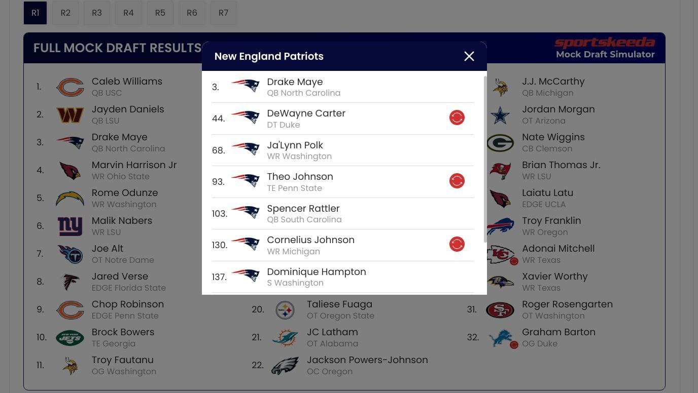 Sportskeeda's 7-round Mock Draft Simulator then has the Patriots use their second-round pick on Bo Nix to theoretically serve as their future franchise quarterback. They also went with Sam Hartman as added insurance later on, potentially replacing both Mac Jones and Bailey Zappe on their roster.
